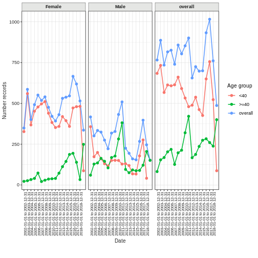 plotRecordCount(recordCount, facet = "sex", colour = "age_group")